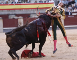 Video images filmed in the ring, and shown hourly on Spanish television, show the bull lifting the man on his horns and tossing him to the floor before attacking him further.